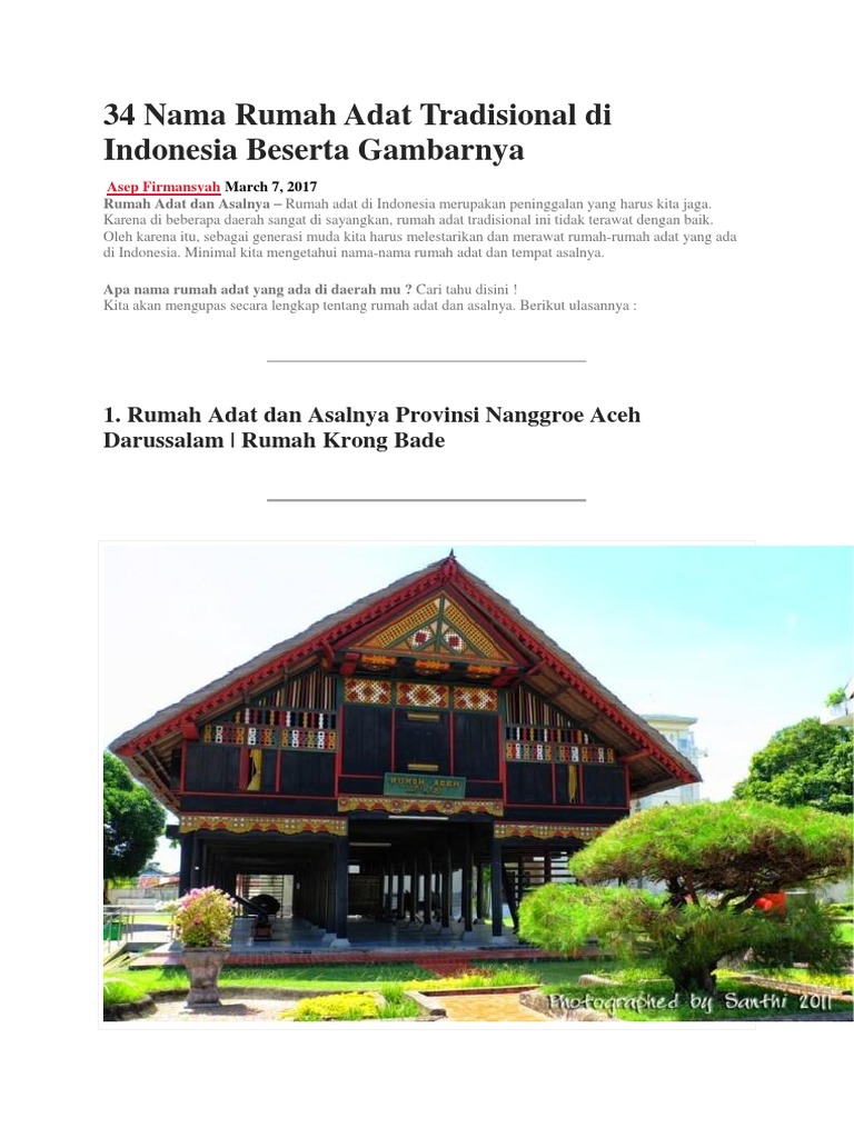 Daftar rumah adat yang ada di indonesia. Gambar & penjelasan rumah adat indonesia dari berbagai daerah seperti: Warisan leluhur berupa aturan adat, kesenian, makanan hingga rumah tradisional, banyak kita temui ragamnya dari sabang sampai merauke. Rumah adat di indonesia merupakan peninggalan yang harus kita jaga. Rumah adat di provinsi ini bercirikan arsitektur melayu seperti yang ditemukan di rumah adat masyarakat suku dani papua disebut dengan nama honai. Disini saya akan memberikan gambar rumah adat namanya. Berikut daftar 34 rumah adat di indonesia beserta asal provinsinya. 34 nama rumah adat tradisional di indonesia beserta gambarnya ! Gambar rumah adat beserta namanya surat kabar. Demikian penjelasan dan gambar tentang rumah adat dari 34 provinsi yang ada di indonesia. Rumah adat dan asalnya serta penjelasannya 34 provinsi, sketsa rumah adat joglo jawa tarian adat, senjata adat, pakaian adat di indonesia. Tidak hanya itu, pakaian adat indonesia juga dapat menjadi sarana pengenalan ragam budaya indonesia yang menarik untuk pria ada namanya pakaian adat safari berupa jas berlengan pendek, biasanya berwarna putih, krem, dan coklat. ✌membahas 34 nama rumah adat di indonesia beserta asal provinsinya✅dan menampilkan dari provinsi sumatera barat, ada nama rumah adat yang sudah cukup populer dan mungkin kita pernah mendengar namanya, yaitu rumah kesimpulan tentang 34 rumah adat dan asalnya di indonesia.